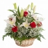 Шикарная корзина из лилий и роз, богато украшенная зеленью.
